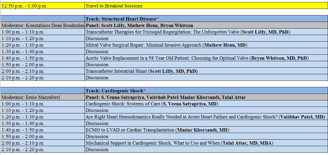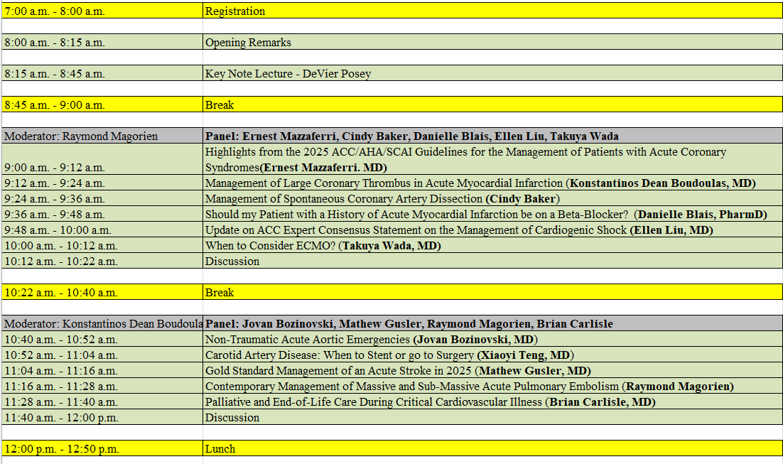 The chain of events favoring good functional outcomes from cardiovascular emergencies begins with diagnosis. These conditions range from acute aortic dissection, cardiogenic shock, coronary artery dissection, left atrial appendage occlusion, peripheral vascular disease, pulmonary embolism, STEMI, to stroke. Data shows that the public’s knowledge of these conditions warning signs remain poor. These conditions require quick assessment, diagnosis and treatment by a facility that can provide timely definitive care to minimize risk for preventable complications and death. Pre-hospital and inter-hospital triage, transport and treatment are critical to determine outcomes for these patients. New devices and drugs have been developed and are in the pipeline for most of these conditions. Technological advances in the management of these conditions may be unknown to clinicians outside of large academic medical centers. Information incorporated into this conference agenda will provide information regarding the most contemporary therapies and treatment modalities and how care providers can rapidly access necessary resources to provide expedient care for their patients.