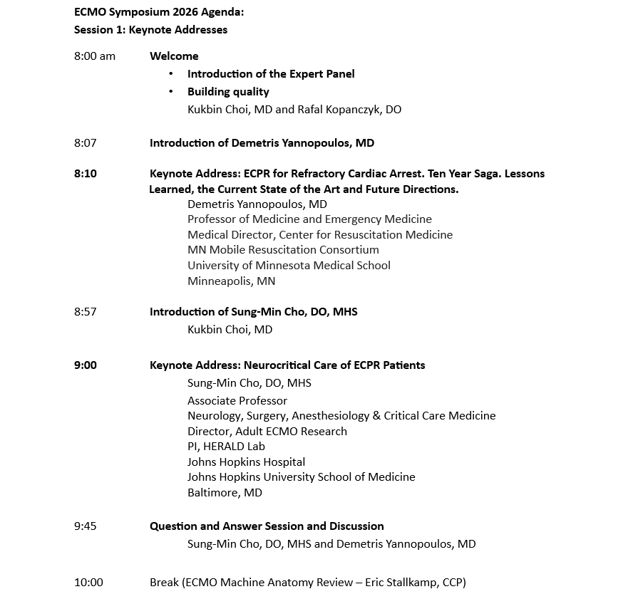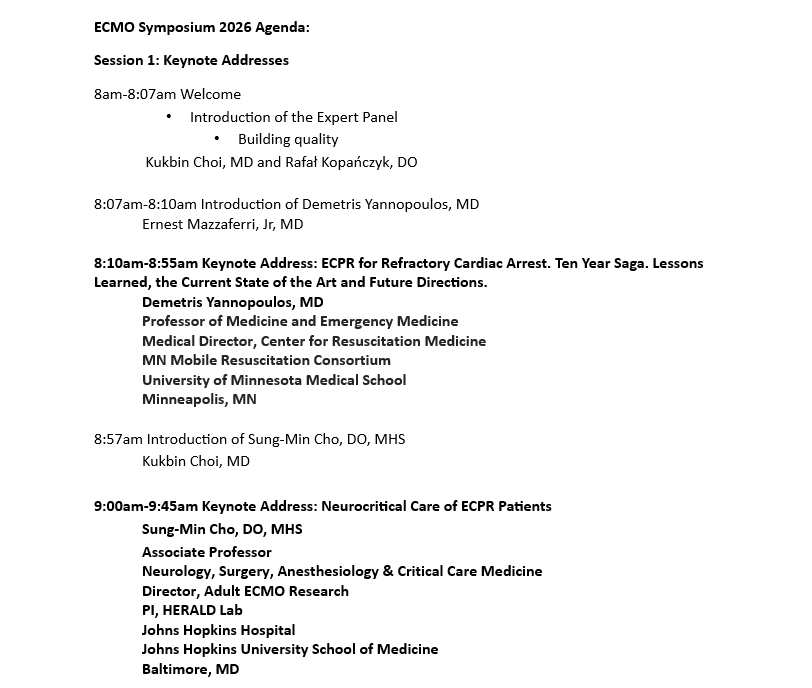 The OSU ECMO Symposium 2026 will deliver a comprehensive, multidisciplinary program focused on the latest advances in extracorporeal life support. Content will include evidence-based clinical updates on patient selection and management for both VA and VV ECMO, cutting-edge hands-on simulation session to enhance procedural and crisis-resource management skills, practical workshop on difficult patient management, and program development. The symposium will integrate expert panel discussions, institutional guidance, and interactive case reviews to support clinicians in critical care, anesthesiology, surgery, perfusion, and allied specialties in optimizing outcomes for patients requiring extracorporeal support.