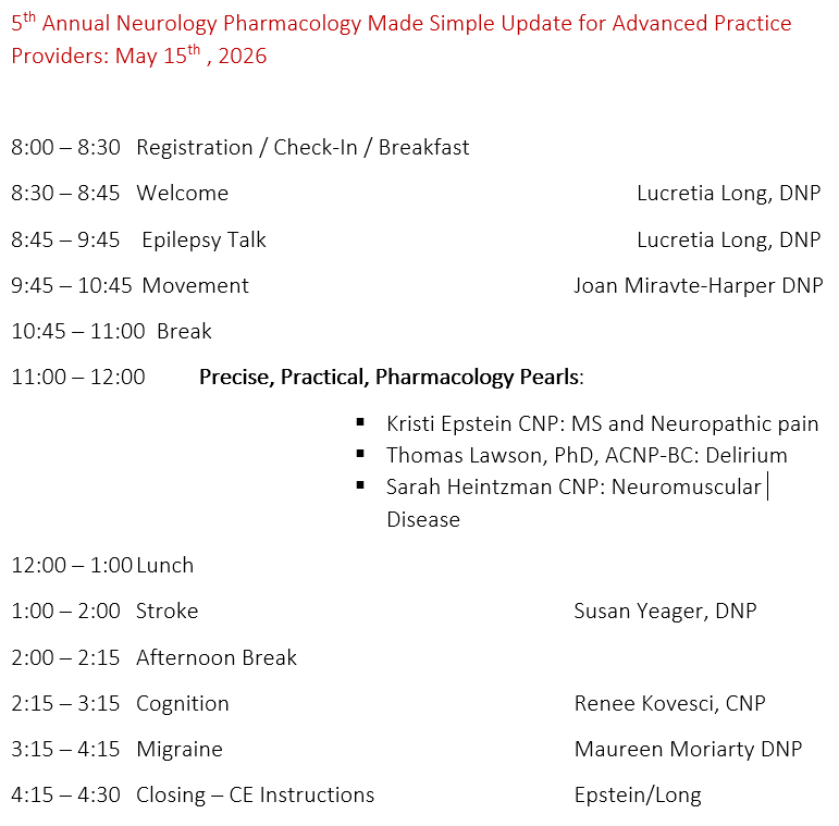 Registration is now live for the Neurology Pharmacology Made Simple: 5th Annual Update for Advanced Practice Providers (APPs) scheduled May 15th, 2026. This hybrid event is back by popular demand and provides a neuropharmacology update by APPS for APPs. The conference is a one of a kind learning experience tailored to make neurology pharmacology easy to comprehend and apply to daily practice. Prior events hosted approximately 500 registrants, including colleagues from 31 states and 8 countries. This year, APP experts will provide pharmacologic updates on epilepsy, migraine, dementia, stroke, movement disorders and more!