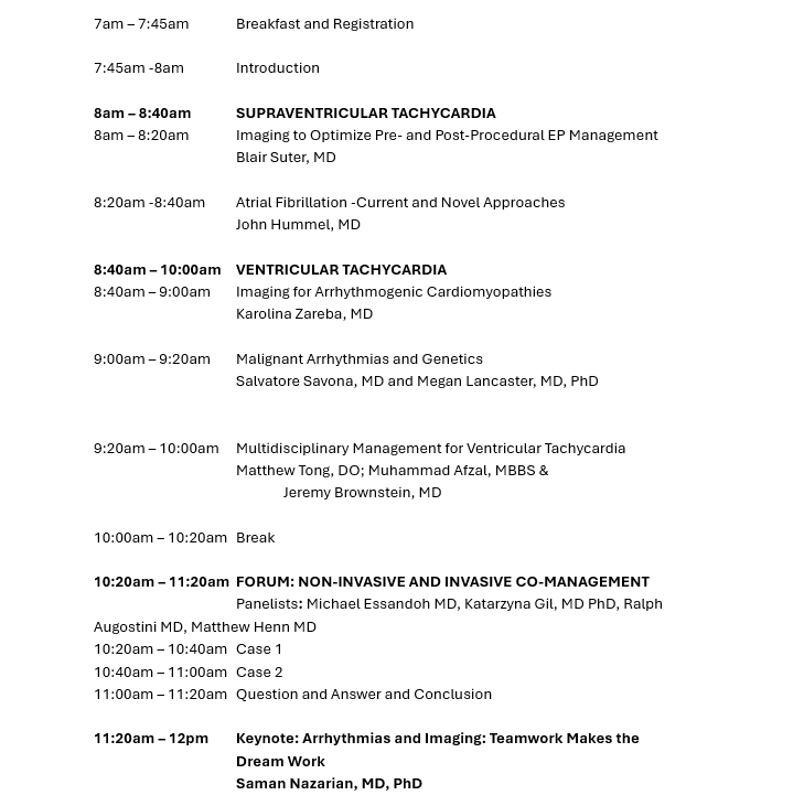 This symposium serves to provide state-of-the-art knowledge in multimodality cardiovascular imaging and arrhythmia management for clinical practitioners, nurses, technologists, and sonographers. During this one-day course, cardiovascular imaging and electrophysiology specialists will share their expertise towards enhancing patient care in routine clinical practice with discussions on the indications for cardiovascular imaging; and the utility of advanced imaging in cardiac magnetic resonance and computed tomography.